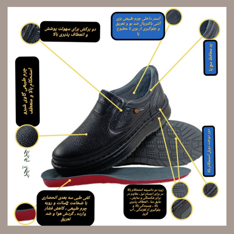 - رویه و آستر کفش از چرم طبیعی گاوی یا بزی درجه یک ساخته شده که تنفسپذیری و دوام بالایی دارد.